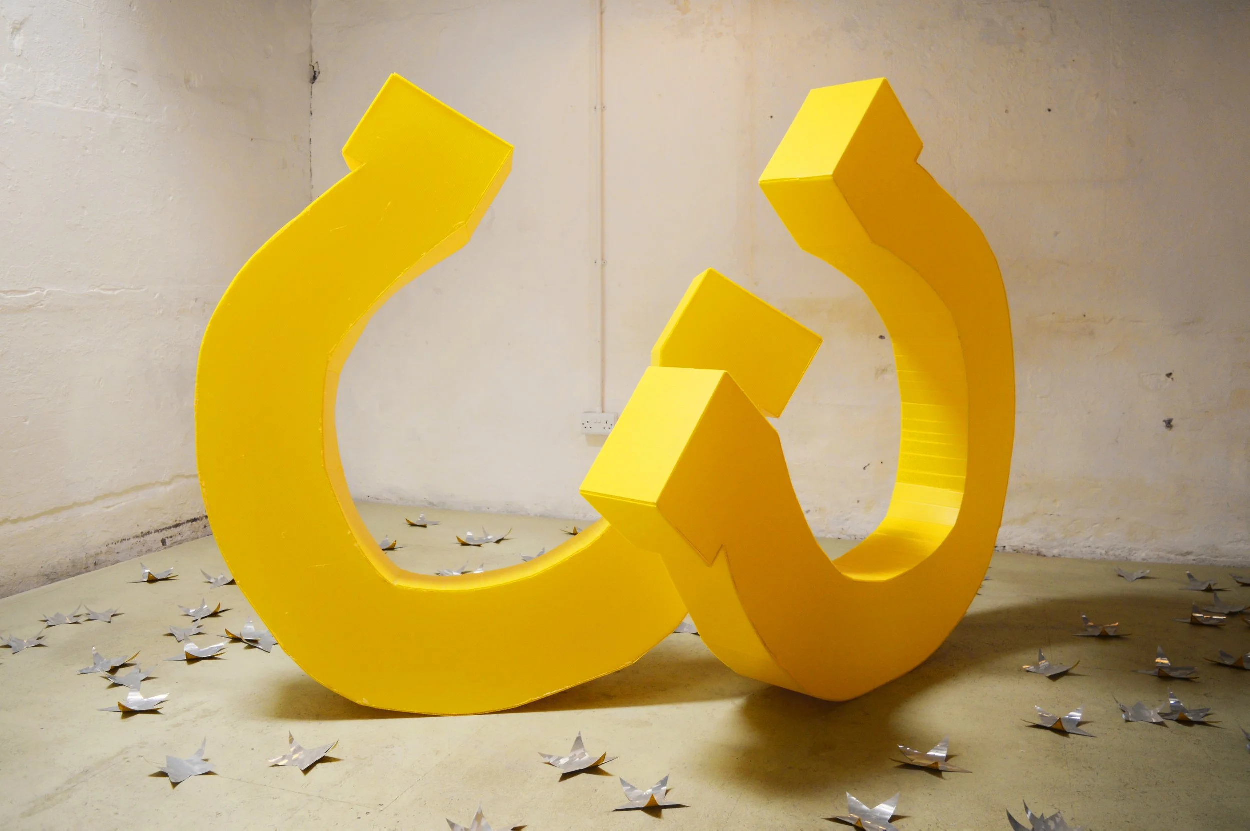 “ Using commonplace signs and symbols as the basis for her larger than life sculptures and installations Grant questions how we relate to and receive information from art. The very obvious messages depicted by her sculptures seem only part of what they are saying, with their simplicity drawing attention to what is implied. “