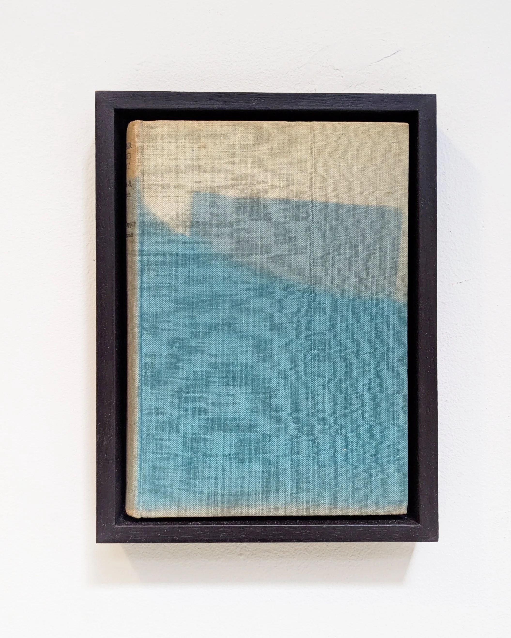 “ This series of found sun-faded, cloth-covered hardback books collected over the last year, in which the ghost images of adjacent books or book ends have left their imprint as silhouettes. As the books are arranged and rearranged on bookshelves over years, a series of multiple exposures to ambient light create geometric collages of superimposed images of what has been.